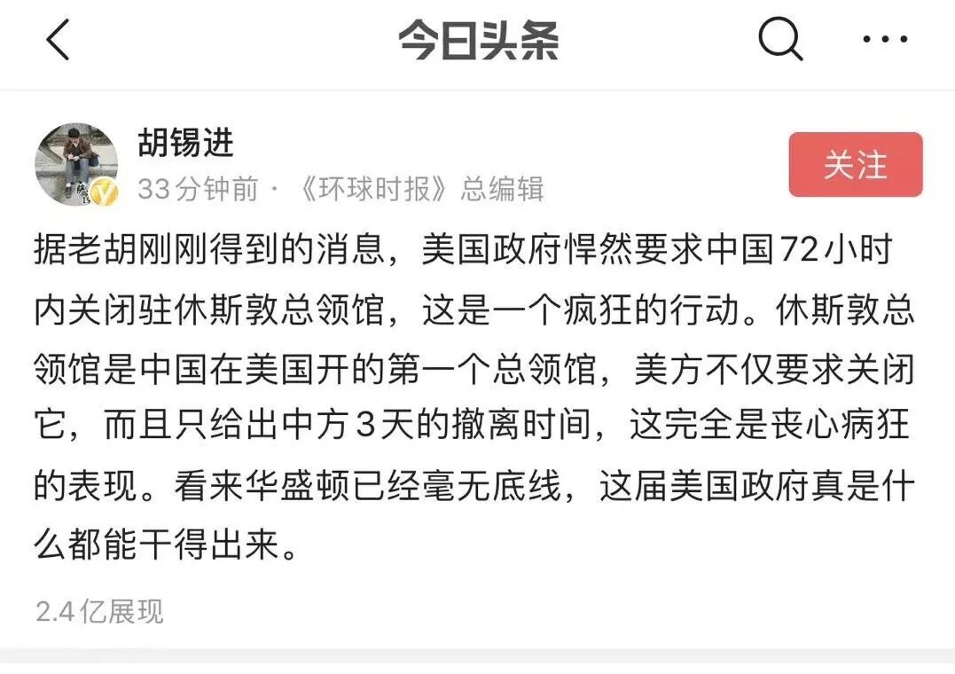 中国官方媒体《环球时报》的总编辑胡锡进在微博上透露更多细节说,中国领事馆被要求在“72小时内关闭”。他称,这是一个“疯狂的行动”。胡锡进表示,休斯敦总领馆是中国在美国开的第一个总领馆,美方不仅要求关闭它,而且只给出中方3天的撤离时间,这完全是“丧心病狂的表现”。