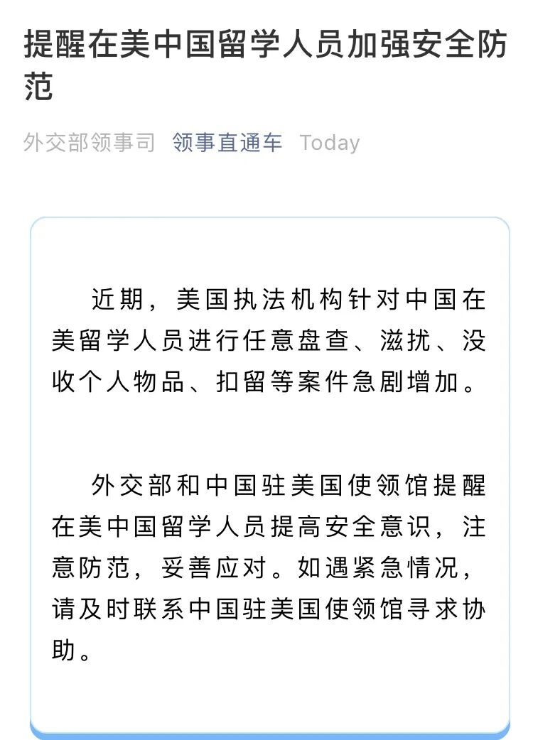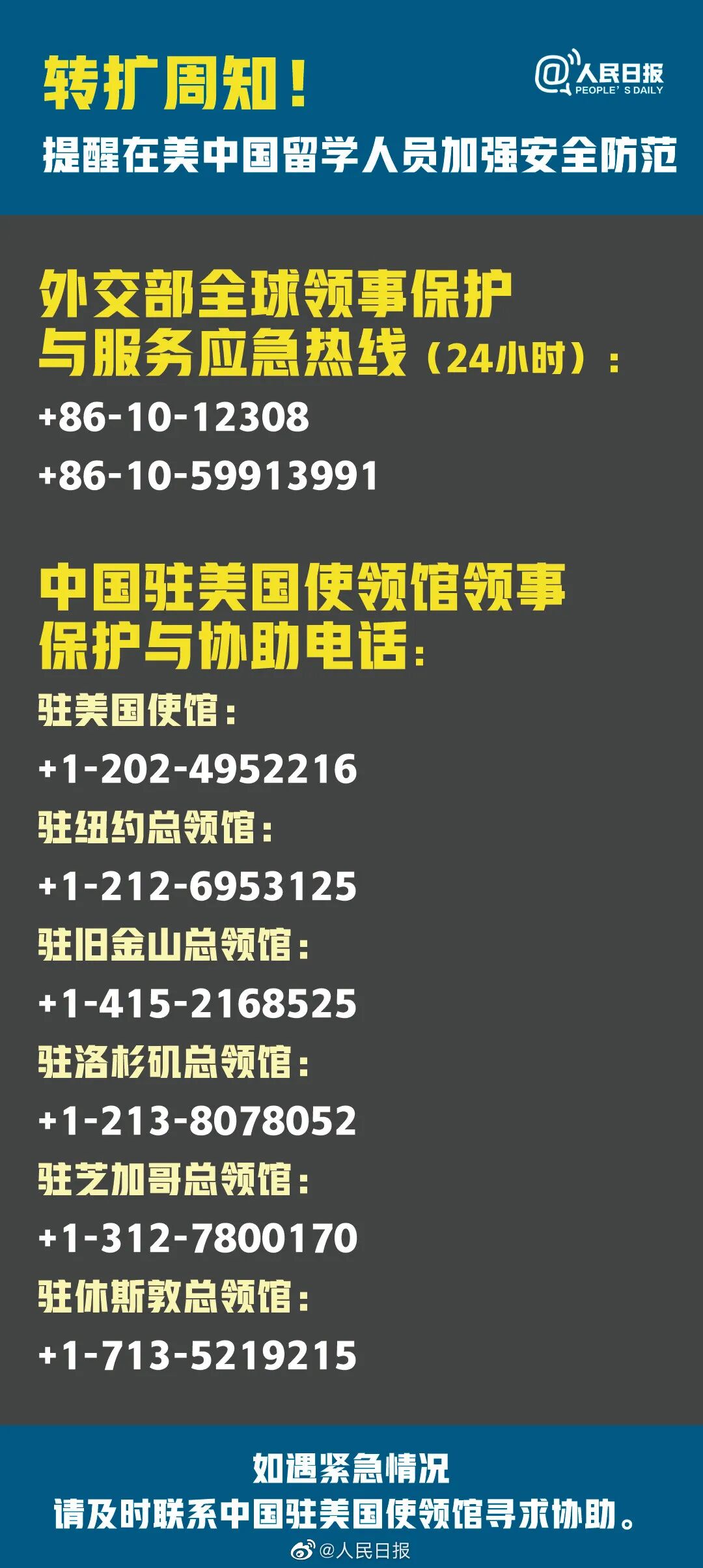 外交部和中国驻美国使领馆提醒在美中国留学人员加强安全防范: