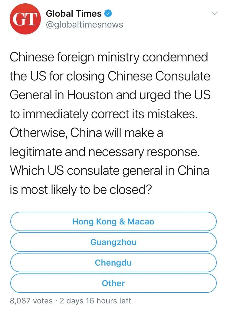 《环球时报》官方账号北京时间周三下午还在推特发起投票,询问民众“哪家在中国的美国领事馆可能被关闭”,选项有“港澳”、“广州”、“成都”及“其他”。
