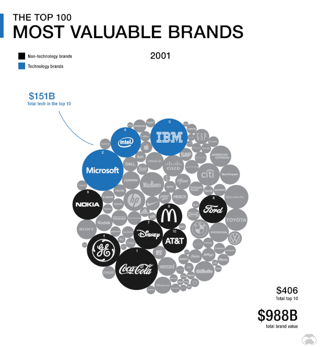 据Interbrand年度“全球最佳品牌榜”,2019年与2001年相比最有价值品牌因科技的影响力变化显著,表明了科技公司在短时间内可以扩展成庞大品牌的程度,从而取代一些世界上最知名的公司。2001年,报告统计的100个品牌的总价值为9880亿美元。